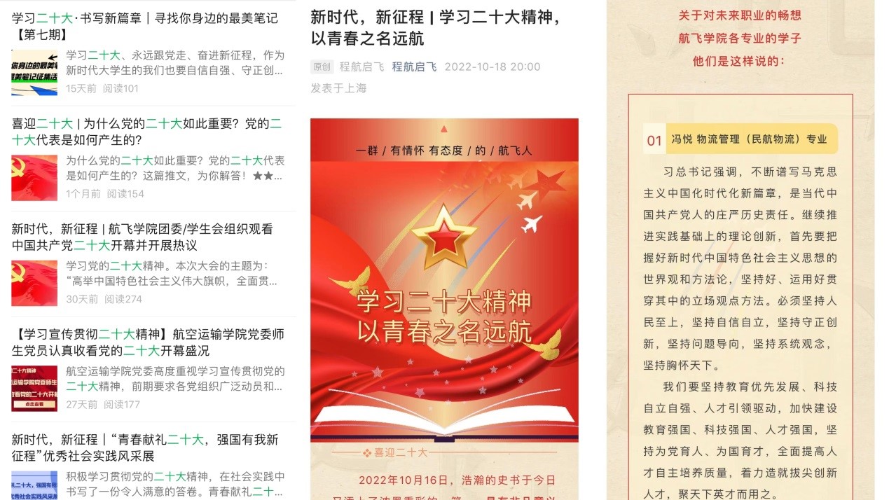 党员积极用好学习强国平台,团员青年通过“青年大学习”平台开展自主学习,通过易班、“程航启飞”公众号,开展特色网络文化活动,在全院范围形成党的二十大精神大参与、大学习之势。