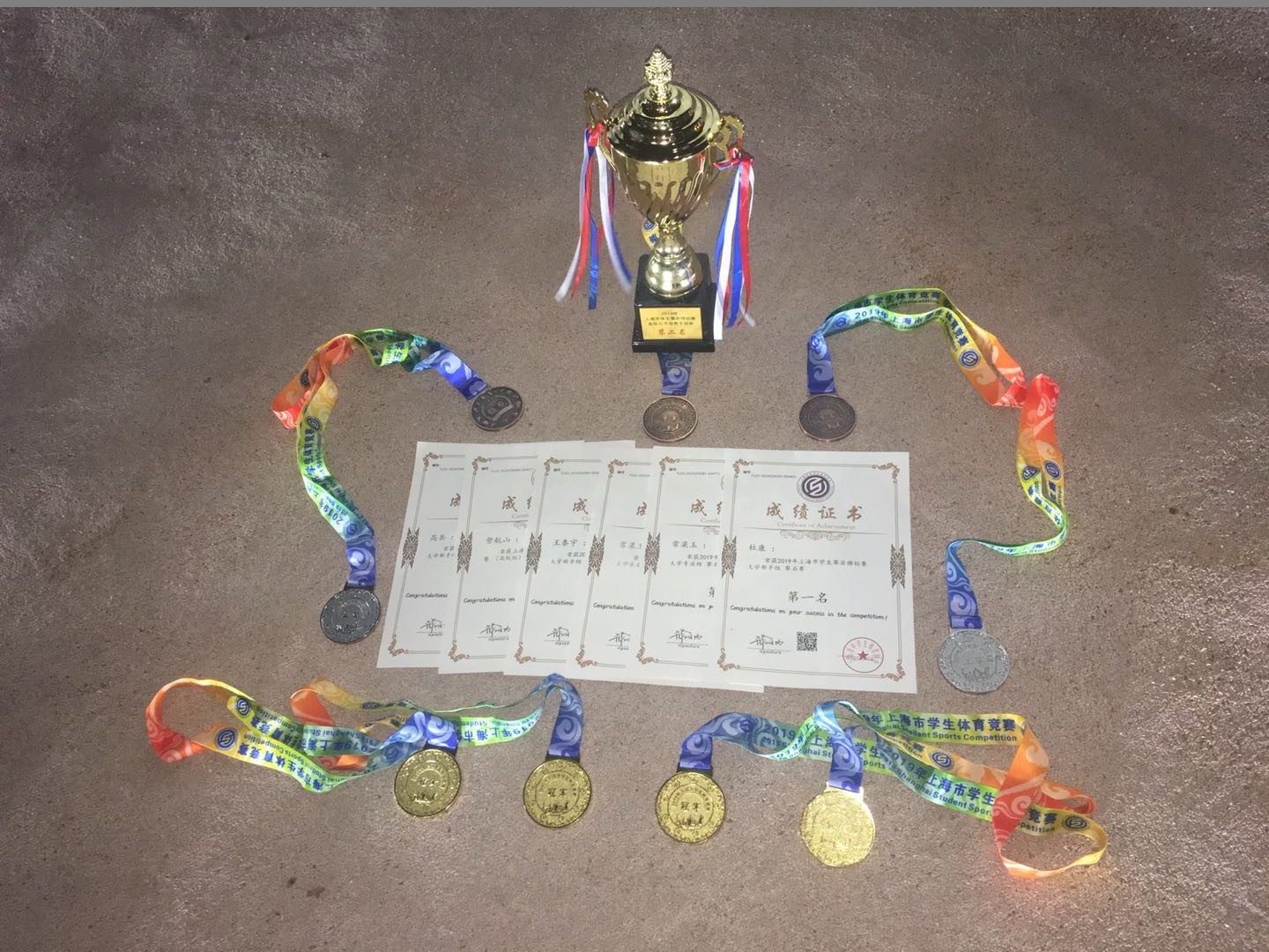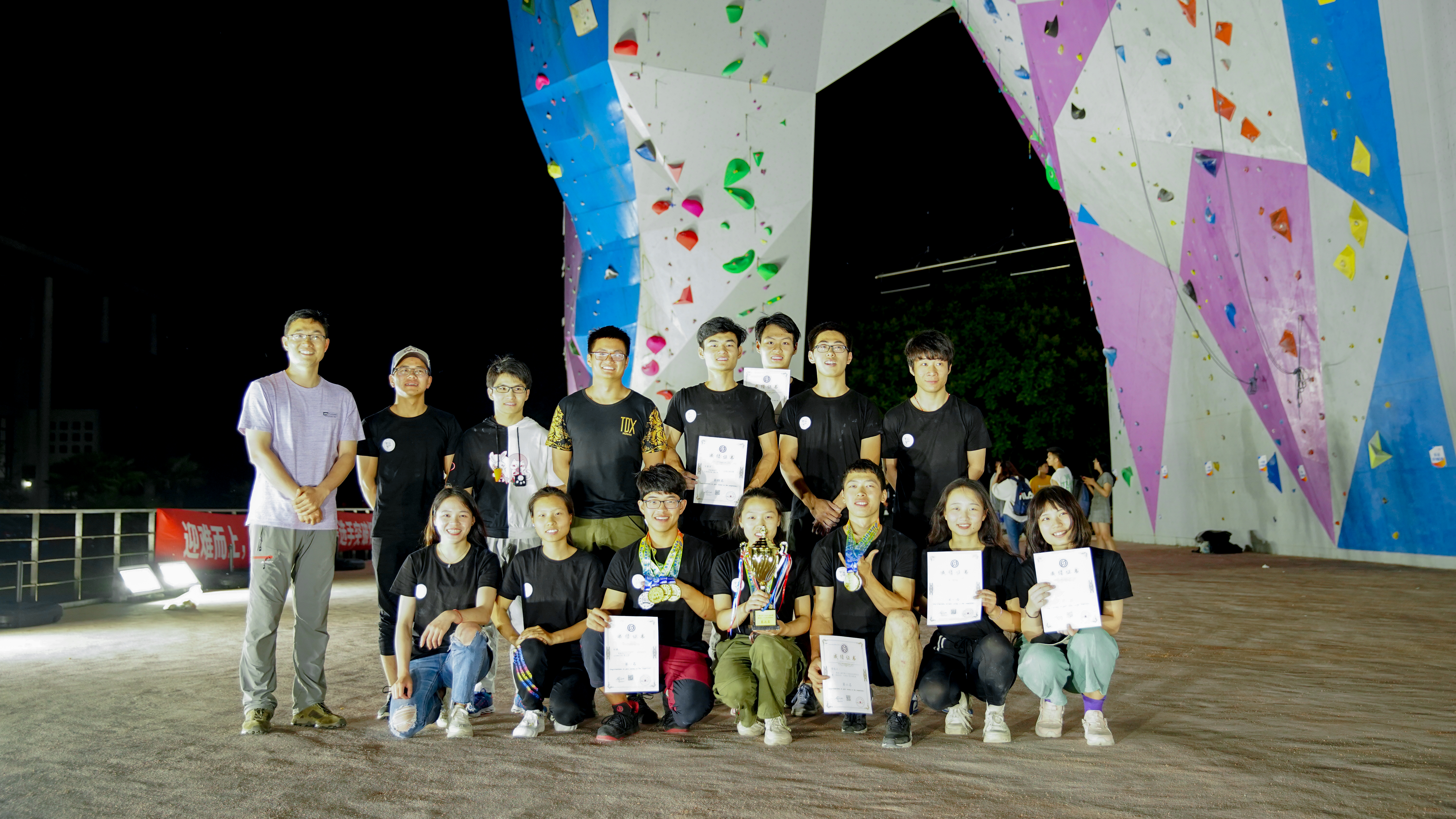 比赛中,我校攀岩队队员发挥出色,将平时的训练成果完美地展现了出来,用实力赢得了在场的选手和观众们的阵阵喝彩。最终杜康同学取得了男子攀石赛、难度赛、全能赛金牌各一块,男子速度赛银牌一块;劳航山同学获得男子攀石赛金牌、全能银牌;常梁玉同学获得攀石赛铜牌、难度赛铜牌、全能铜牌,另外学校获得团体第二名的优异成绩。