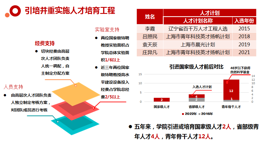 引培并重实施人才培育工程。学院党委根据人才特点和发展阶段,设立国家级人才“特区”,全力优化人才发展的工作环境、制度环境,激发高层次人才创新创造活力。秉持求贤若渴的态度,对选准看好的人才“苗子”,安排专人对接联系,了解需求并提供个性化培养方案,为优秀人才开启绿色通道。五年来,学院引进或培育国家级人才2人,省部级青年人才4人,青年骨干人才12人。