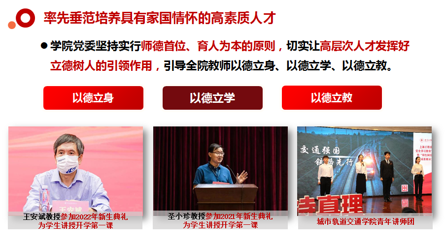 率先垂范培养具有家国情怀的高素质人才。国家级人才王安斌教授、圣小珍教授为新生讲授开学第一课,以浓厚的家国情怀、深厚的知识学养、高超的学术造诣激励学生奋发有为。学院党委积极打造轨道青年讲师团品牌,并将王安斌、圣小珍教授的奋斗故事融入宣讲,引领更多学子成长成才。