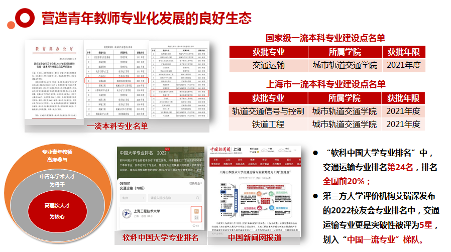 营造青年教师专业化发展的良好生态。学院牢牢把握国家高等教育政策发展趋势,抢抓交通运输“国家一流专业”、轨道交通信号控制和铁道工程“上海市一流专业”建设机遇,在学科专业建设中形成“高层次人才为核心、中青年学术人才为骨干、青年教师高度参与”的发展生态,实现学科专业与师资建设跨越式发展。近年来,交通运输学科在“软科”“校友会”等机构全国排名中大幅攀升,位列第27名(全国前20%),跻身“中国一流专业”梯队。