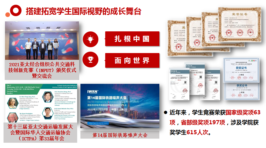 搭建拓宽学生国际视野的成长舞台。学院高层次人才以“扎根中国、面向世界”为理念,通过搭建学术交流平台、承办学术竞赛等形式,积极推进“第二课堂”建设。主动对接APCE,ICTP等国际组织机构争取交通科技竞赛主办权,使得2021亚太经合组织(APEC)公共交通科技创新竞赛、第十三届亚太交通运输发展大会暨国际华人交通运输协会、第14届国际铁路噪声大会成功落户学院,拓宽了学生的国际视野和成才舞台。近年来,学生竞赛荣获国家级奖项63项,省部级奖项197项,涉及学院获奖学生615人次。