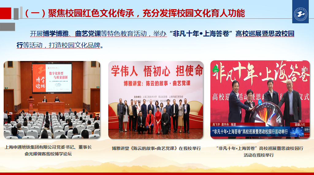 聚焦校园红色文化传承,充分发挥校园文化育人功能。学校开展博学博雅、曲艺党课等特色教育活动,举办非凡十年上海答卷高校巡展暨思政校园行等活动,打造校园文化品牌。完善“三圈三全十育人”工作体系,提升教师育德意识能力。把学习宣传贯彻落实党的二十大和市第十二次党代会精神作为主线,用好用活上海红色资源,引进“上海党的诞生地”等展览,强化教师在育人中的主导作用。强化正面宣传引导,提振教书育人责任感。发挥榜样示范作用,利用官微等平台推送优秀教师典型事例;牵头排演大师剧《周志宏》,传承大师精神。从各个方面充分挖掘“身边人、身边事、身边物、身边景”,全方位、立体化弘扬正能量。