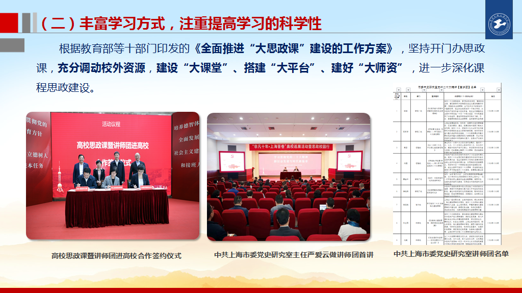 丰富学习方式,注重提高学习的科学性。根据教育部等十部门印发的《全面推进“大思政课”建设的工作方案》,坚持开门办思政课,充分调动校外资源,建设“大课堂”、搭建“大平台”、建好“大师资”。学校与中共上海市委党史研究室加强合作,举办思政课暨讲师团进高校合作签约,引入校外专家宣讲团。积极推荐优秀思政课教师入选党的二十大精神宣讲团,今年于凯教授入选上海市宣讲团成员,刘志欣教授入选市教卫工作党委系统专家宣讲团成员,为建好校院两级中心组理论讲师团打下坚实基础。