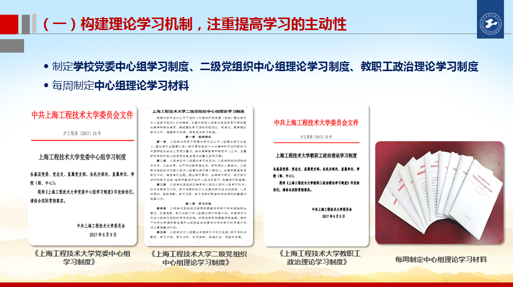 构建理论学习机制,注重提高学习的主动性。学校关注提高全体教师的思政水平,制定学校党委中心组、二级党组织中心组、学校教职工政治理论学习制度,加强各二级单位党组织对教师理论学习的管理与考核。每周制定中心组理论学习材料,突出重点,把准方向。坚持“党委统一领导、党政齐抓共管、宣传部门组织协调、全体二级单位积极配合”的工作机制,每年制定教职工政治理论学习指导意见,开展二级党组织理论学习中心组学习巡听旁听工作,推进教职工理论学习常态化长效化。第一时间出台《上海工程技术大学关于认真学习宣传贯彻党的二十大精神的实施方案》,把深入学习贯彻党的二十大精神作为重中之重。