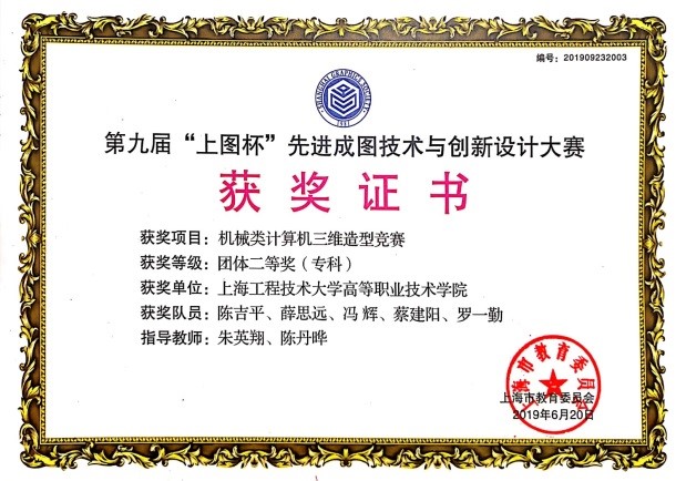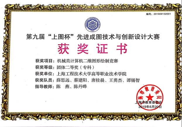 第九届“上图杯”先进成图技术大赛近日落下帷幕,经过激烈角逐,上海工程技术大学高职学院代表队勇夺高职组团体一等奖1项、团体二等奖2项、个人一等奖4项、个人二等奖7项,制图组指导教师陈丹晔、余启志、陈燕和朱英翔获得优秀指导教师奖。这也是高职学院基础教学部制图教研组参加该项以来,连续九年蝉联上海市专科组一等奖,获奖人数和奖项级别位居所有参赛学校专科组第一。