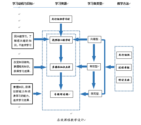 围绕教学目标,依照在线课程学习的特征,将课程内容进行知识点分解,并将学习对象分为三个类型:兴趣型、有效型和探究型。不同的学习者其学习目标也不相同,将教学内容划分为核心教学内容(视频教学材料)、补充内容(多媒体知识点详解材料)和拓展内容(专题研讨材料),一方面不同需求的学习者可以选择与之相配的学习资源;另一方面,教学资源的开放和共享,教学过程中通过设置测试、加强互动研讨,促进学习者从兴趣型向有效性、探究型转变,提升课程教学的有效度。