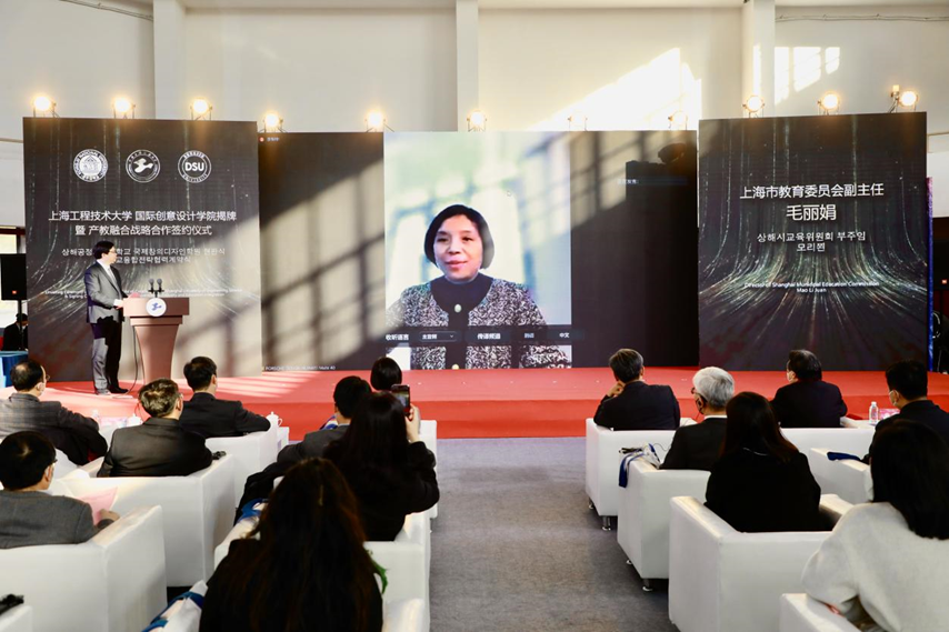 上海市教委副主任毛丽娟祝贺上海工程技术大学获批国内第一所艺术类中韩合作办学机构。她指出,学院的获批对上海打造教育对外开放新高地、建设世界一流“设计之都”具有十分积极的意义。她提出三点期望:一是牢记办好人民满意的教育方向,落实立德树人的根本任务;二是勇担服务地方经济发展的使命,紧紧围绕上海经济社会发展的需求,持续完善科教融合和产教融合育人模式,为上海经济社会发展和建设产教融合型城市做出积极贡献;三是坚持高质量国际化办学,努力在办学质量上下功夫,在办学特色上出实招,办出特色,办出高水平,在促进上海“设计之都”建设和推动“三省一市”朝着共建亚太地区教育新高地的过程中发挥积极作用。