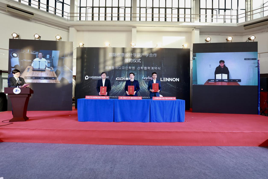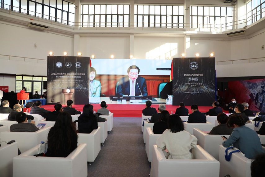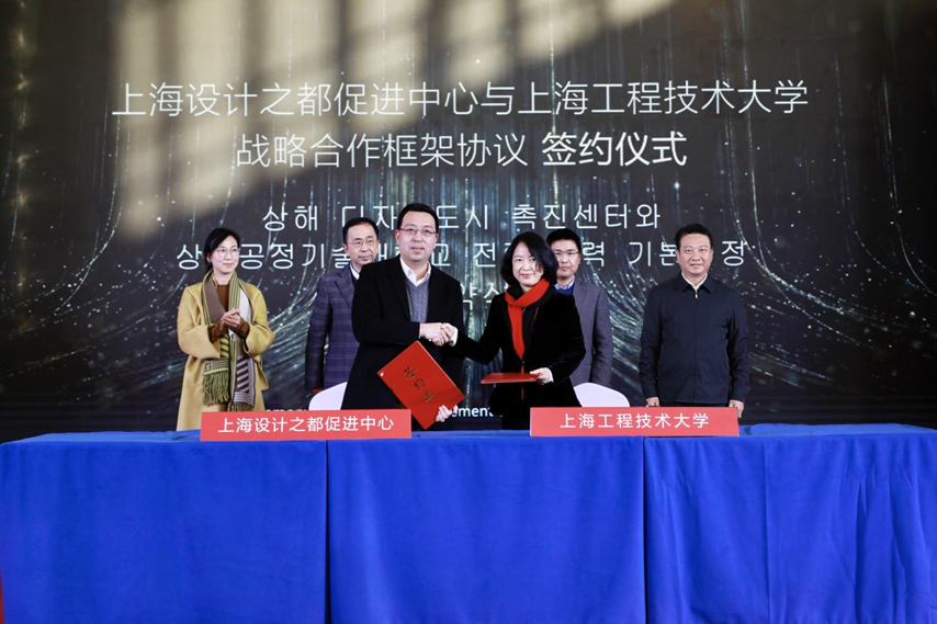 在与会领导嘉宾见证下,上海工程技术大学与上海设计之都促进中心签署了战略合作框架协议,国际创意设计学院与中韩两国四家合作企业签署了产学合作协议。