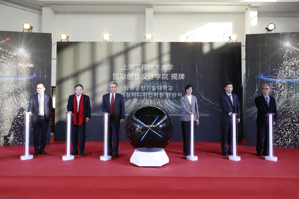 仪式上,金胜镐总领事与李江书记共同为国际创意设计学院揭牌。金胜镐总领事、松江区副区长顾洁燕、上海教育国际交流协会秘书长李维平秘书长、李江书记、俞涛校长和金锺琪院长共同发布了国际创意设计学院名称、院训和标识。
