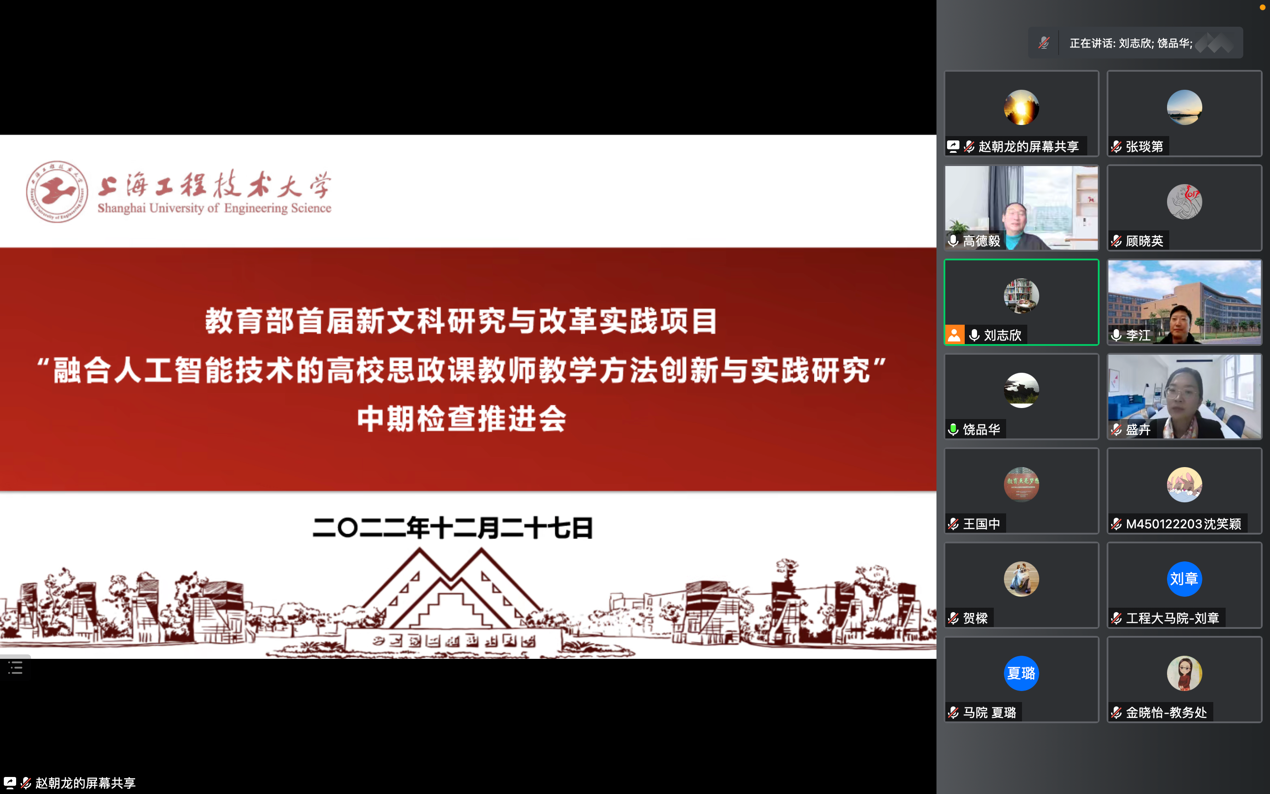 12月27日下午,我校在线召开教育部首届新文科研究与改革实践项目“融合人工智能技术的高校思政课教师教学方法创新与实践研究”中期检查推进会议。校党委书记李江教授、副校长夏春明教授出席会议,会议特邀上海市政府重大行政决策咨询专家、原教育部形势与政策教指委主任委员、博士生导师高德毅教授,教育部高校思政课教指委委员、同济大学马克思主义学院院长、博士生导师徐蓉教授,北京数字思政研究院执行院长盛卉,教育部课程思政教学研究示范中心(上海大学)负责人、上海大学教务部副部长、博士生导师顾晓英教授,国家科技创新2030“新一代人工智能”重大项目管理专家组成员、华东师范大学计算机科学与技术学院副院长贺樑教授等多位专家学者出席会议。校教务处、马院、人工智能研究院负责人、项目组成员参加会议。会议致辞环节由教务处处长饶品华主持,评审环节由专家组组长高德毅教授主持。