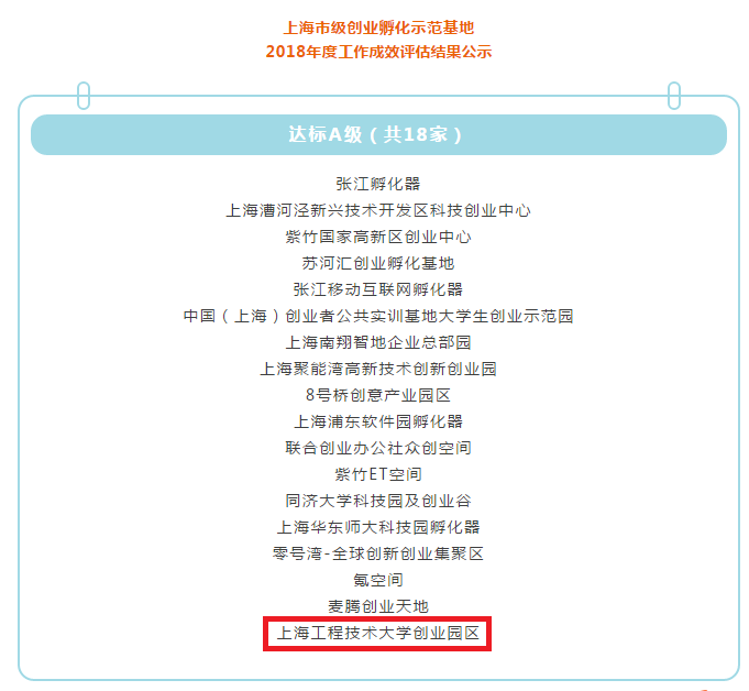 为充分发挥上海市级创业孵化示范基地帮扶引领作用,根据《上海市就业促进中心关于开展市级创业孵化示范基地年度工作成效评估的通知》(沪就促〔2017〕22号)的相关规定和要求,上海市在区推荐申报的基础上,委托第三方机构,对全市114家市级创业孵化示范基地2018年度的工作成效进行评估,最终共有18家单位获评最高等级“达标A级”,我校创业园区被评为“达标A级”。