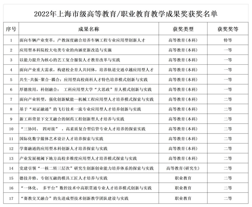 2022年,学校强化统筹,加强优势资源整合,提质培优,着力培育高质量教学成果,获上海市教学成果奖共计17 项,其中特等奖1项,一等奖5项,二等奖11项。获奖总数在上海市排名第十,在应用技术型高校中排第一。