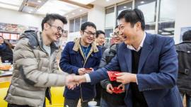 走过满怀活力的2015年,我们即将迎来充满希望的2016年。2月6日是农历腊月二十八,俗称“小年夜”,在这辞旧迎新的美好时节里,为传播温暖传递关怀,学校领导和相关部门人员为留校学生准备了一顿丰盛的年夜饭,让留校学生虽然不回家也能感受到家人般的温暖。16:30,学校第四餐厅张灯结彩,披上了节日的盛装,“2016年寒假留校学生年夜饭活动”在这里举行,党委书记李江,党委副书记夏斯云,党委副书记、副校长裴小倩以及党办、校办、研究生处、学生处、保卫处和后勤实业发展中心等职能处室负责人、相关学院党委(党总支)副书记和辅导员等出席了本次活动,活动由校“梦工厂”话剧团团长刘天力同学主持。