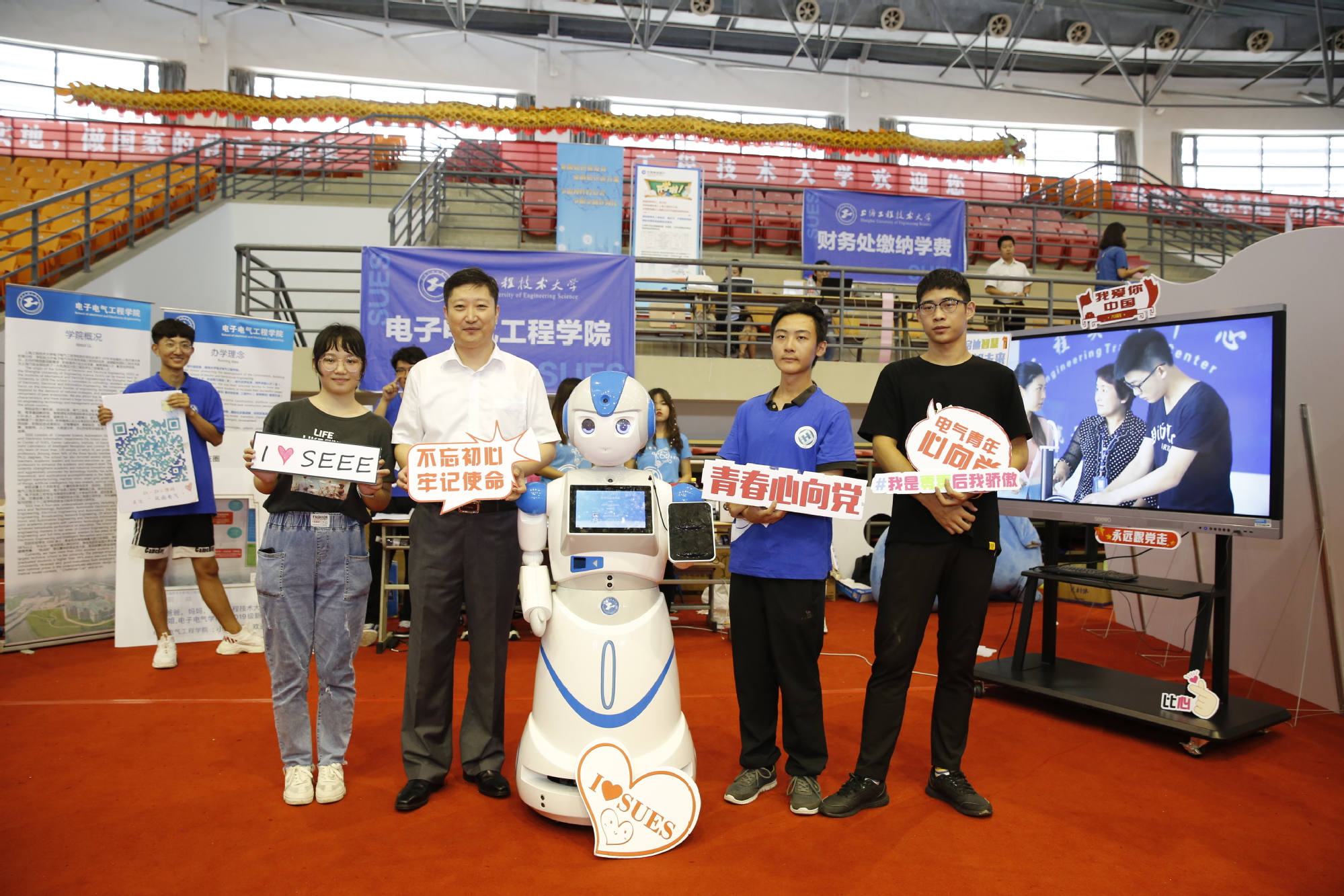 “怎么选课?”“学校健身房如何预约?”“如何加入学生会?”电子电气工程学院结合专业特色,定制了一台“迎新机器人”,外表呆萌的机器人“小电”有一双充满笑意的眼睛,总能机智地回答新生们的各种提问,进行实时语音交流,成功吸引了一大批新生粉丝。服装学院组织了三名身着华服的模特现场走秀,让刚刚入学的服装新生感受专业初体验。城市轨道交通学院将迎新现场布置成“地铁车站”,“萌新”们手拿地铁模型,纷纷在“车站”边打卡拍照。管理学院还特意组织了留学生志愿者,让远道而来的留学新生也有宾至如归的感觉。目前,学校已成为全国首个5G校园,尖端的科技,便捷的服务,为新生们营造了良好的校园科技生态环境。