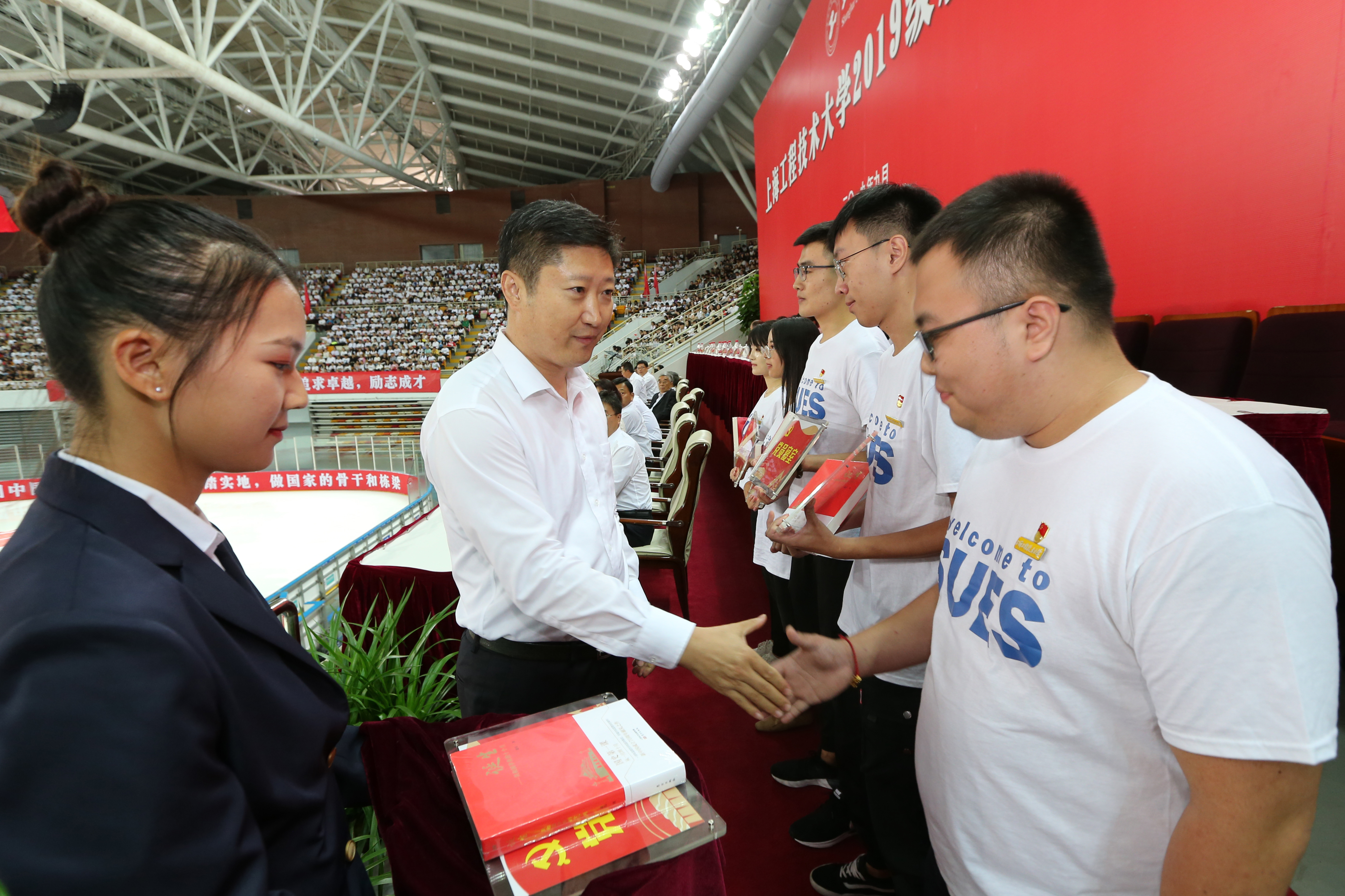 校党委书记李江为新生党员代表颁发党员寝室铭牌、赠送书籍,寄语青年学生党员们不忘初心、牢记使命,用坚定的信念、用激扬的青春,用实际行动汇聚起实现中华民族伟大复兴中国梦的磅礴力量。