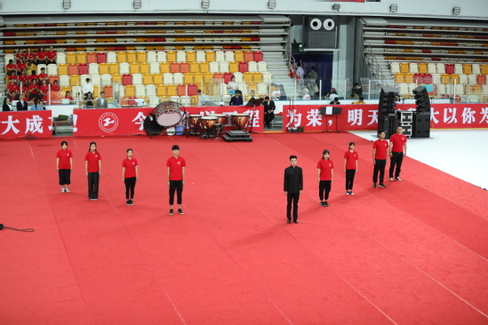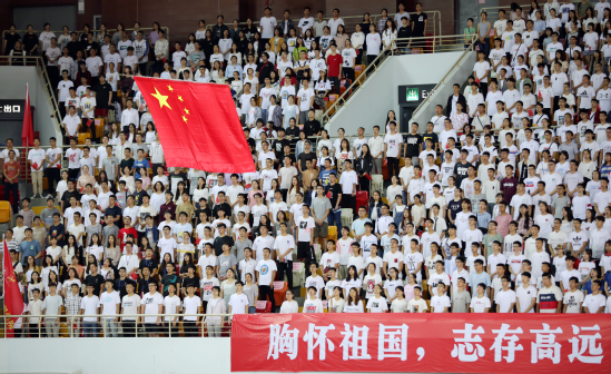 典礼最后,全场师生在校合唱团带领下共唱《我和我的祖国》,巨幅国旗在同学们挥舞的手中传递,所有新生饱含深情,共同献礼祖国母亲70华诞。