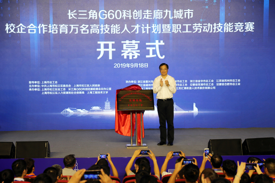 开幕式上,上海市人大常委会副主任、市总工会党组书记、主席莫负春为我校“长三角G60科创走廊九城市校企合作高技能人才实训基地”揭牌。