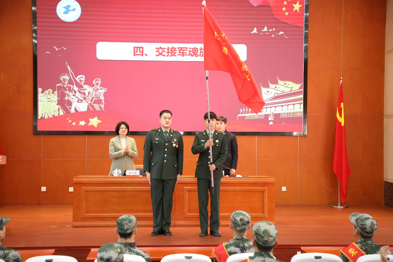 武装部专武干部陈磊宣读2023年春征役前集训入营学生名单。退伍老兵马铭孜与入营新兵学生代表交接工程大士兵军魂旗,希望同学们传承军魂精神、肩负神圣使命,再创新的辉煌。