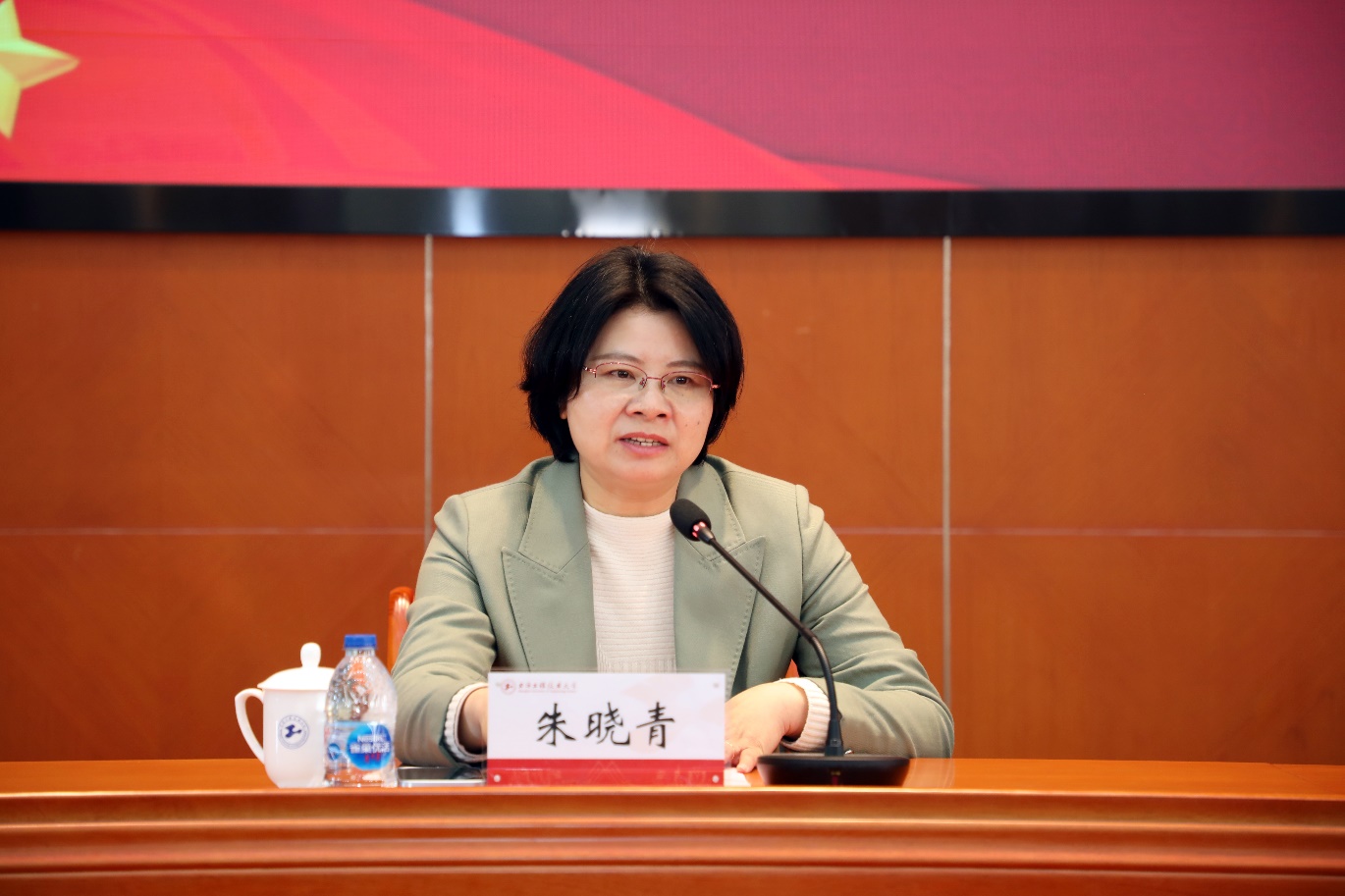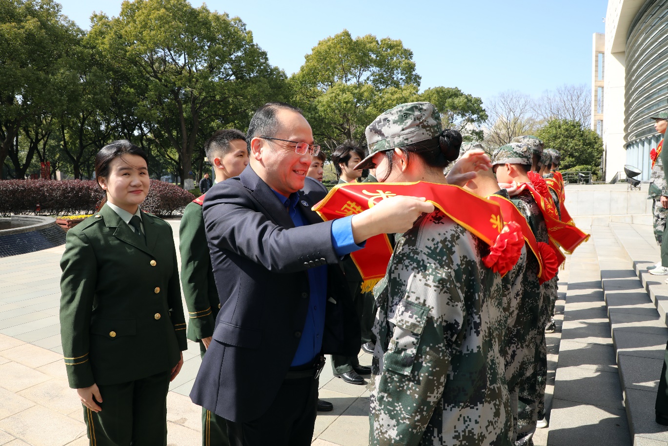 在欢送现场,校长俞涛,校党委副书记、副校长朱晓青为即将入营参加2023年春征役前集训的准新兵佩戴光荣入伍绶带并合影留念。俞涛校长对34名参加役前集训的同学表示衷心祝贺,对他们的爱国之情、报国之志致以崇高的敬意。他勉励同学们要坚定理想信念,坚决听党指挥,努力为国争光,把热血挥洒在实现强军梦的伟大实践中,用奋斗为青春添彩,以实际行动扛起新时代革命军人的使命担当,为国家强军兴军事业做出更大贡献。