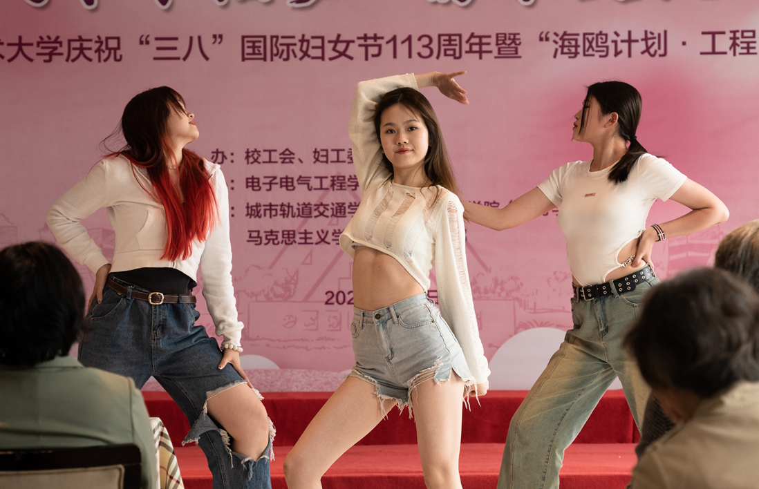 师生们带来了精彩纷呈的演出。校管弦乐团的竖琴独奏《G.Pierne Impromptu Caprice》,让大家感受音乐之美;城市轨道交通学院教师表演的经典舞剧《杜甫》片段《丽人行》娴雅优美,展现了学校青年教师的多才与朝气;航空运输学院学生表演手势舞《早安,阳光》,鼓舞广大师生奋进新征程,逐梦新时代;电子电气工程学院学生讲师团的诗朗诵《从三月里款款走来的女子》,展现了女性通过自己的智慧和勇气,为社会的进步和发展做出了不可磨灭的贡献;城市轨道交通学院通过迷你木偶剧《“她”守护的故事》,鼓励女性勇敢地站出来,提高自我保护意识,掌握自我保护技能;纺织服装学院和学生体育总会带来表演《salty&sweet》,通过律动的节拍,展现青春与活力;校学生艺术团、校教工合唱团演唱了《母亲的微笑》,带来温暖和力量。在场的师生们共同参与了“中国服饰文化的传承与发展”体验活动,制作非遗手工京剧娃娃,感受中国服饰文化力量。
