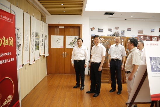 为庆祝中华人民共和国成立70周年,由离退休党工委、老干部办公室、退休工作处、校老教授协会共同举办的“我和我的祖国——上海工程技术大学离退休教职工艺术作品展”,9月25日在松江校区教工活动之家开幕。校党委书记李江、校党委副书记史健勇出席了开幕式,并为艺术展揭幕。