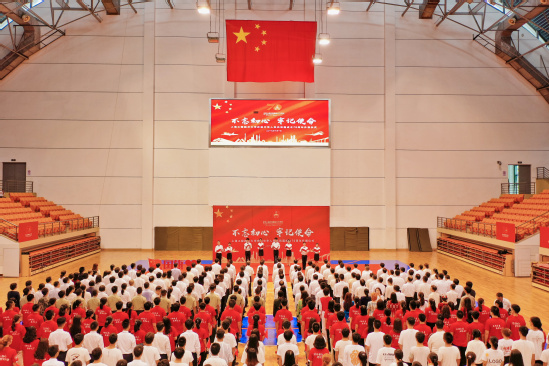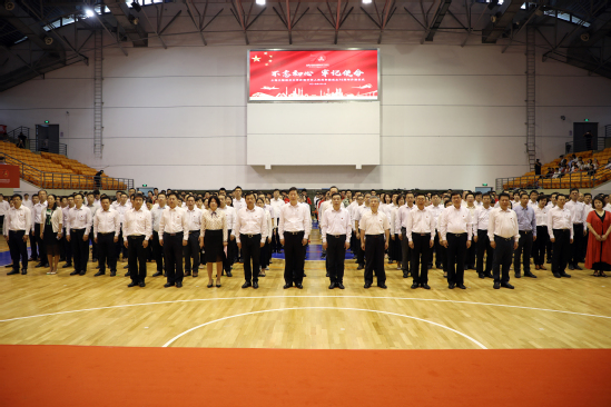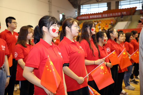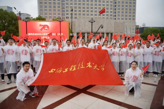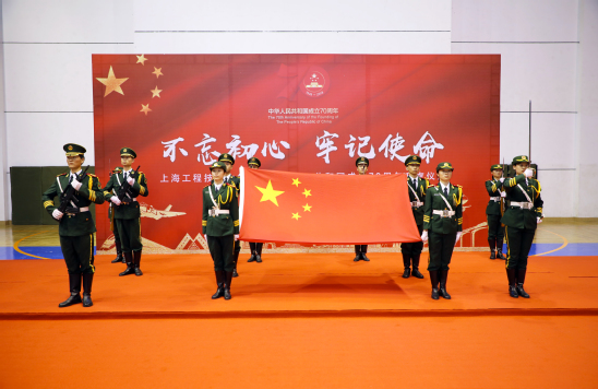 上午8时,学校在松江校区体育馆举行“不忘初心、牢记使命”庆祝中华人民共和国70周年升旗仪式,全体校领导、全体中层干部、退伍学生代表、少数民族代表、青年师生代表参加了升旗仪式。伴随着庄严的旋律,学校国旗护卫队成员踏着铿锵有力、整齐划一的步伐护送国旗入场。国歌声响起,全场行注目礼,齐声高唱中华人民共和国国歌。仪式上,青年学生代表诵读了《祖国赞歌》,表达了新时代青年对于新中国70华诞的真挚祝福,以及将青春梦融入中国梦,实现中华民族伟大复兴的坚定决心。最后,师生们挥舞手中的红旗,共同唱响《歌唱祖国》,唱出凝心聚力的爱国情怀,唱出团结奋斗的铿锵之声,激扬的旋律飘扬在场馆,感染着在场所有的人。同时,我校150名合唱团学生参加了上海市在人民广场举行的国庆升旗仪式,我校是唯一参与此活动的高校。
