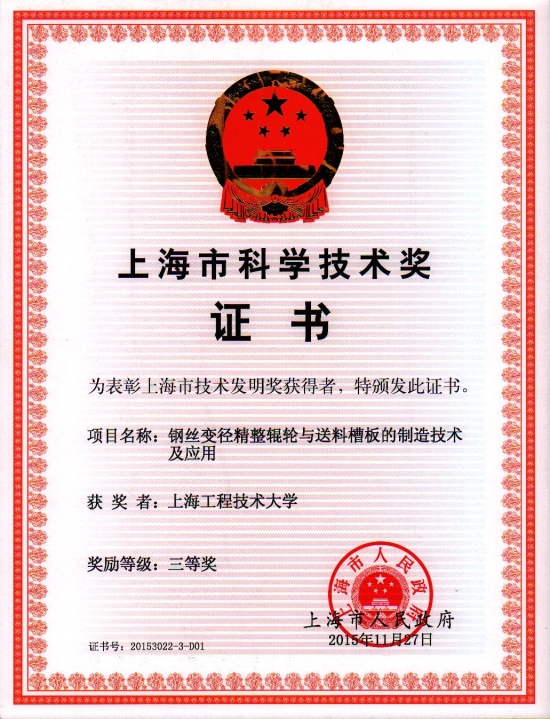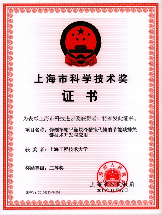 获得上海市科技进步三等奖的“锌制车轮平衡块冷精锻代铸的节能减排关机技术开发与应用”项目,由工程实训中心徐新成教授主持,钱嘉明、赵春峰、宋哲夫、王淑新、张阿虎等老师参与,项目以冷精锻为主的精密塑性成形技术代替传统铸造工艺,去除了能耗极大的锭料再熔融工序,节能减排效果显著,各项技术指标处于国际先进水平。获得上海市技术发明奖三等奖的“钢丝变径精整辊轮与送料槽板的制造技术与应用”项目,由航空运输学院、飞行学院贾慈力副教授主持,沈耀仁、刘燕、陆文华等老师参与,项目从材料及非标改性热处理工艺着手,充分发掘材料特性,研制了几种工艺技术,消除了早期失效现象,提高了工模具的使用寿命,目前此项目已获得3项发明专利授权。