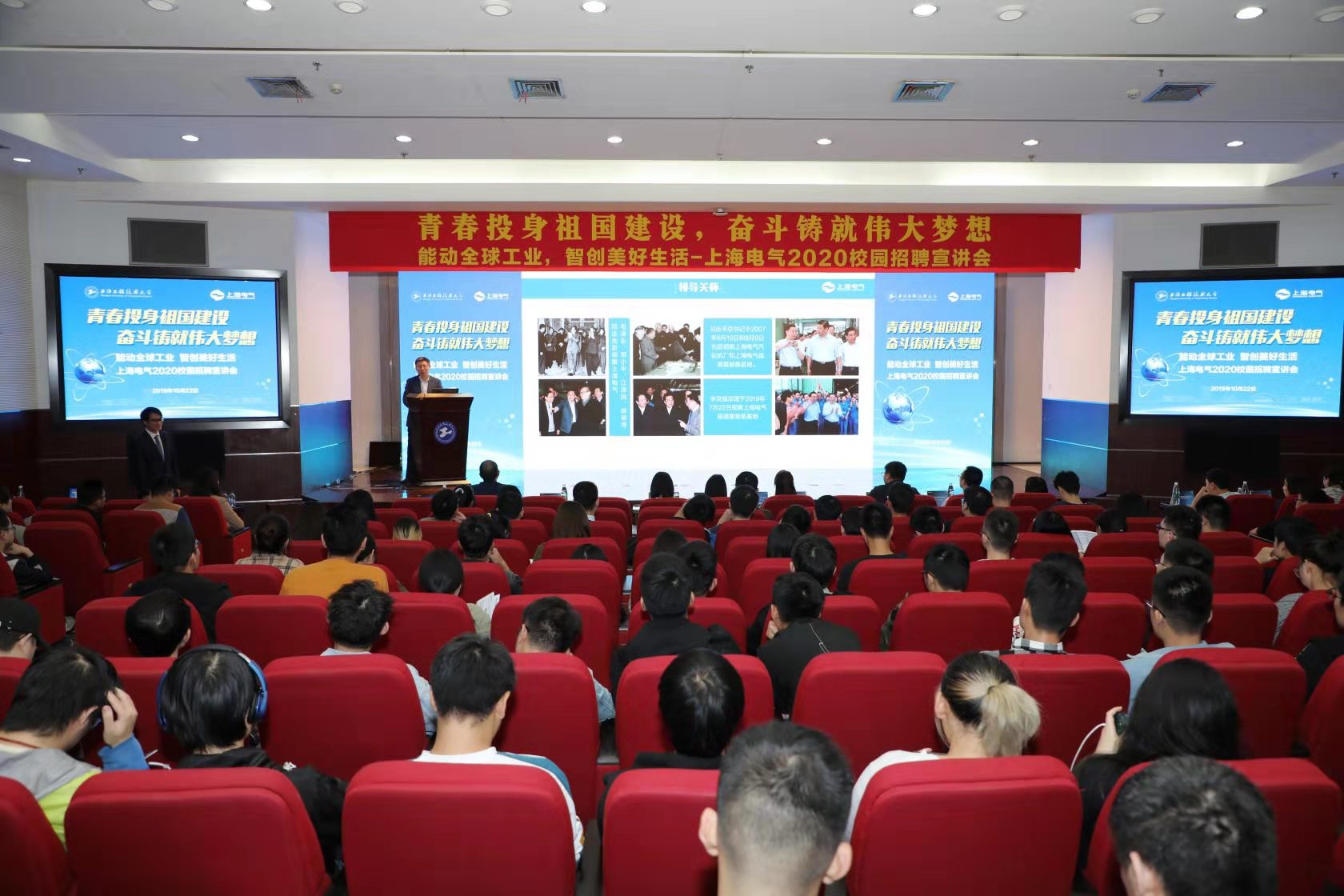 10月22日下午,青春投身祖国建设,奋斗铸就伟大梦想——“能动全球工业,智创美好生活”上海电气2020校园招聘宣讲会在图文信息中心第二报告厅成功举办。上海电气集团携同下属上海电气输配电集团、上海电器股份有限公司人民电器厂和上海南华兰陵电器有限公司等多家企业共同参加。会前,校党委副书记、副校长朱晓青在相关职能部门负责人的陪同下,接待了上海电气集团党委副书记朱兆开一行并进行亲切会谈。