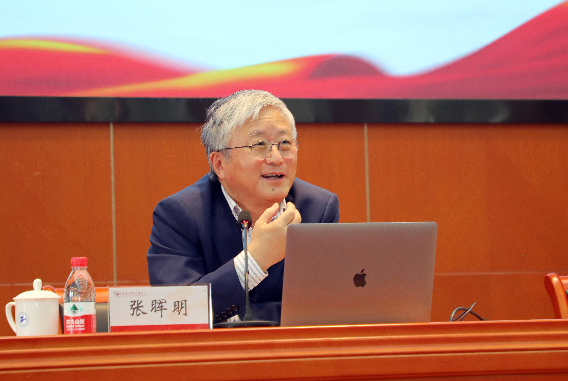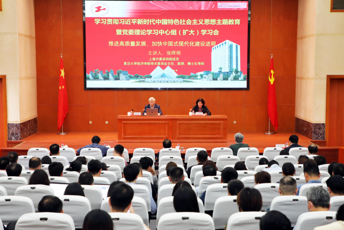 5月5日下午,学校召开学习贯彻习近平新时代中国特色社会主义思想主题教育暨党委理论学习中心组(扩大)学习会,特邀上海市委讲师团成员、复旦大学经济学院学术委员会主任、教授、博士生导师张晖明来校作题为《推进高质量发展,加快中国式现代化建设进程——党的二十大报告精神学习交流》的专题辅导报告,引导广大党员、干部学思想、见行动,在学深悟透中进一步坚定理想信念,筑牢思想之基。校党委中心组成员、中层干部、辅导员代表、形势与政策教师参加会议,会议由校党委副书记、副校长朱晓青主持。
