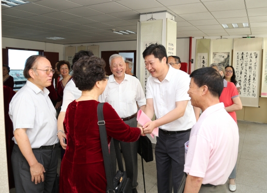 李江书记、夏斯云副书记共同为纪念建党95周年、纪念红军长征胜利80周年退休教职工第六届书画展揭幕,并与老同志们共同欣赏了书画作品,此次共展出书画作品50余幅。校领导亲切慰问书画作者,高度赞扬老同志们热爱书画艺术、保持健康向上精神追求的良好风貌。活动现场,校退休教职工合唱团满怀激情地演唱了《长征组歌——告别》、《我和我的祖国》等歌曲,退休教职工剑舞队神采奕奕地展示了她们婀娜的舞姿,精彩的表演展示了我校退休教职工奋发向上的精神风貌,赢得了全场阵阵热烈的掌声。校工会常务副主席沈海庆宣读了获得“2016年上海市高校退休教职工桥牌比赛”获奖人员名单,夏斯云副书记向获奖人员颁奖并颁发了纪念品。