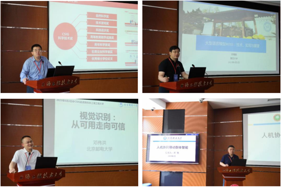 本次研讨会特邀业内著名专家,北京大学彭宇新教授、北京邮电大学刘驰教授、复旦大学邱锡鹏教授、北京邮电大学邓伟洪教授作大会主题报告,共同探讨了“数据-知识协同驱动的细粒度多模态感知与生成”“大型语言模型MOSS的技术、实现与展望”“视觉识别:从可用到可信”以及“人机协同边缘群体智能”等重要议题,对图像图形处理和大模型等领域的最新研究成果以及未来发展趋势进行了分析阐述。同时,本次会议还邀请了浙江大学吴飞教授、哈尔滨工业大学(深圳)聂礼强教授、复旦大学肖仰华教授等知名专家学者对我校方志军教授牵头承担的科技部科技创新2030-新一代人工智能重大项目进行指导,共同探讨人工智能技术在智能制造领域的前沿技术研究和应用落地。