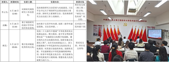 学院党委注重引导师生党员着力把握习近平新时代中国特色社会主义思想的科学体系和精髓要义,不断筑牢信仰之基、补足精神之钙、把稳思想之舵,努力筑牢忠诚干净担当的思想根基。学院党委全体党员领导干部紧扣学习主题,紧密联系实际开展专题党课,先后组织开展了《对新时代调查研究工作的思考》《基于调查研究的设计学学科组织体系重构》《数字技术赋能优秀传统文化》等8次专题党课。艺术设计学院党委书记李云先在专题党课授课过程中,紧紧围绕党的二十大决策部署,聚焦职责使命和中心任务,重点讲解了习近平新时代中国特色社会主义思想的世界观、方法论和贯穿其中的立场观点方法,主要讲述了党的调查研究方法沿承与实践演进、习近平总书记关于调查研究重要论述的主要内容、新时代主要调研方法、党的调查研究方法改进工作上的路径等,将党的创新理论作为指导学院科学分析形势、研究问题、推动发展的“总钥匙”
