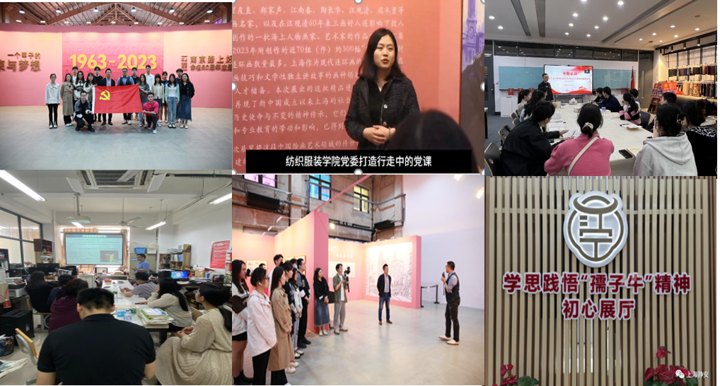 “面”上共振,师生党员系统学。“把支部建在课堂上”,在学习通平台建立党支部学习阵地,持续更新主题教育、课程思政等相关学习资料,让理论学习随时随地。根据《习近平在上海》一书梳理出19处习近平总书记在上海的足迹,目前已组织寻访13处足迹点,在寻访场景中讲述新思想,打造“行走的微党课”,沉浸式体悟新思想新理论。充分发挥专业优势,组织设计主题教育学习卡、纺织文创作品、足迹点印章等主题教育文创作品,引导支部党员在专业实践中淬炼思想、锤炼本领。广大党员师生积极将思想伟力转为生动实践,中法教师党支部党员教师为习近平在上海的足迹——江宁路街道党工委设计“孺子牛”标识并被采用。服装艺术党支部发挥艺术专业优势,以文化自信、中华服饰文化传播为支点,筹建“艺术传播红色精神”长廊。通过以上系统学习让理论“活起来、用起来、热起来”,不仅入眼入耳、更能入脑入心入行。