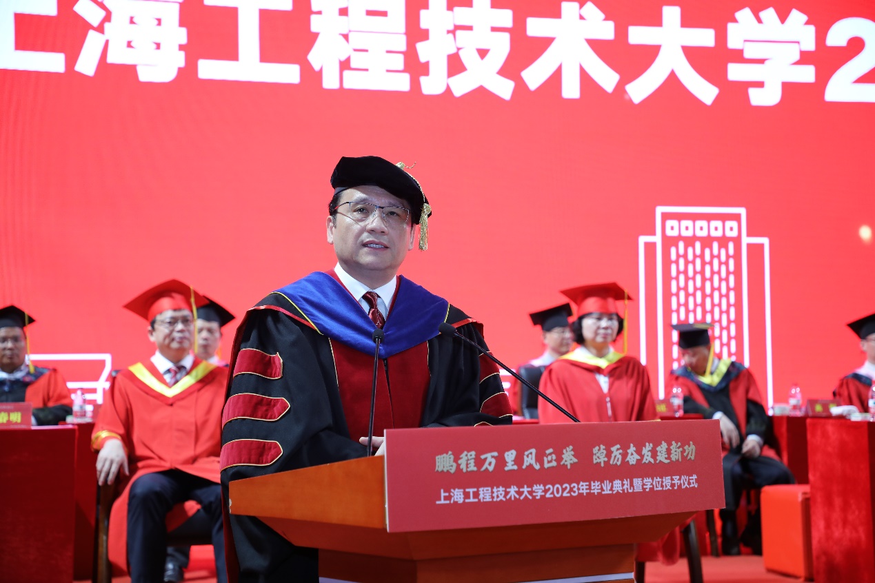 7月8日上午,上海工程技术大学2023年毕业典礼暨学位授予仪式在松江校区体育馆隆重举行,全体校领导、校学位评定委员会成员、各学院党政领导、校友代表、教师代表、毕业班辅导员、2023届毕业生、2022届毕业生特邀代表共同出席了本次毕业典礼。