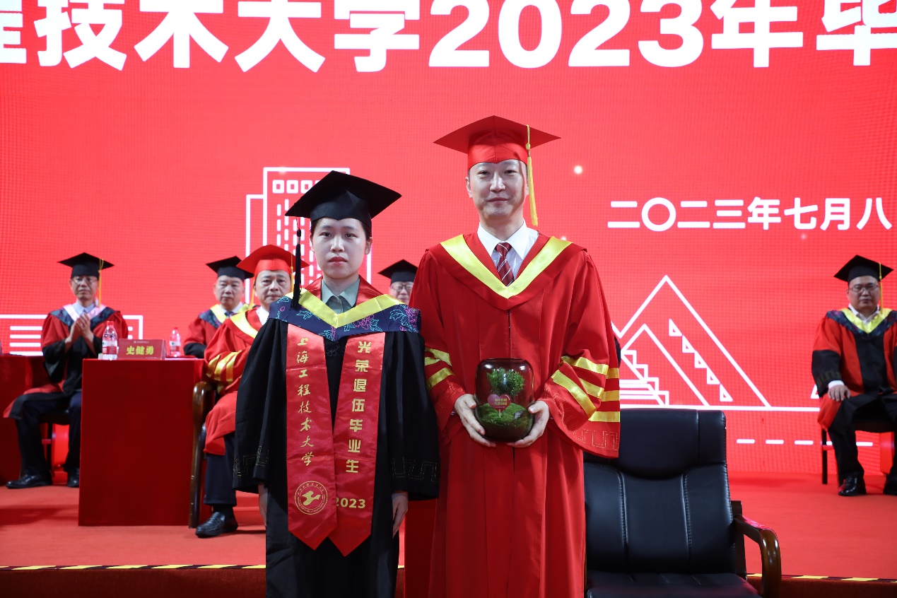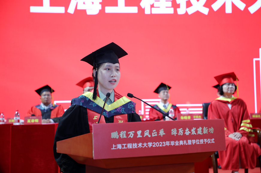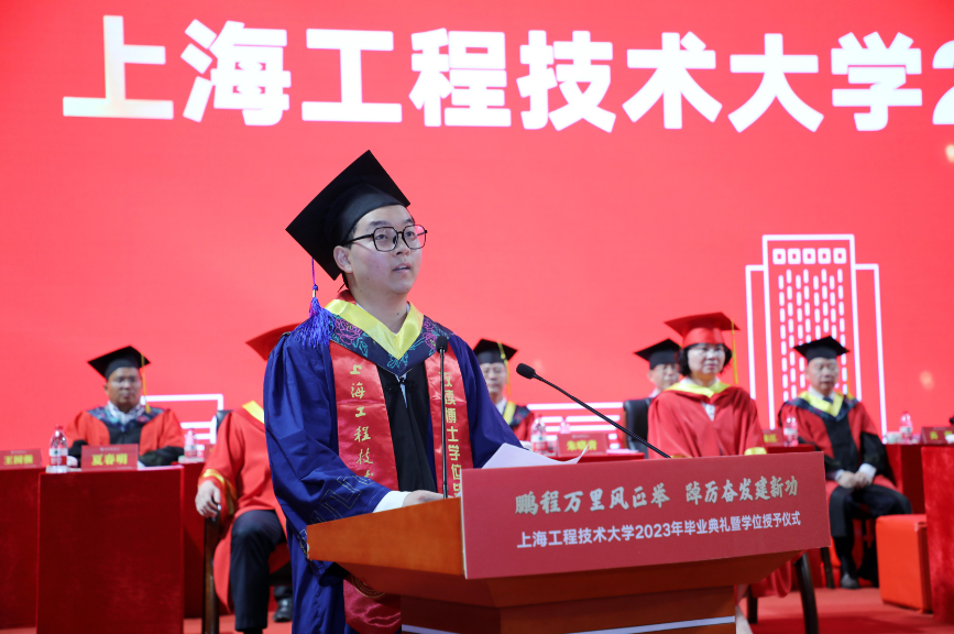 2023年上海市优秀毕业生、机械与汽车工程学院研究生毕业生程耀天分享了自己在程园求学奋进的成长故事,围绕校训精神,讲述了自己对母校的感恩之心,对恩师的感激之情,并激励同学们勤学善思、笃行实干,谱写实现中华民族伟大复兴的绚丽篇章。大学生志愿服务西部计划参与者、退伍学生、2023年校优秀毕业生,来自纺织服装学院的本科毕业生田欣萌结合自己携笔从戎、投身军营、援疆支教、扎根西部的亲身经历,诠释了工程大学子“青春不以山海为远,志愿只向家国未来”的使命与担当。