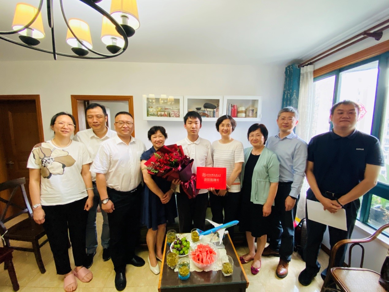 航空运输学院(飞行学院)党委书记徐建华、原东航人力部空勤人员招聘管理分部高级经理代颖丽、东航人力部空勤人员招聘管理分部副经理陈强、东航人力部空勤人员招聘管理分部招飞主管陈阵、上海市第四中学党总支书记、校长史正伟、高中班主任冯奕一行,冒着高温来到徐盛怀同学家里,共同将上海工程技术大学2023年第一份录取通知书送到学生及其家长手中。