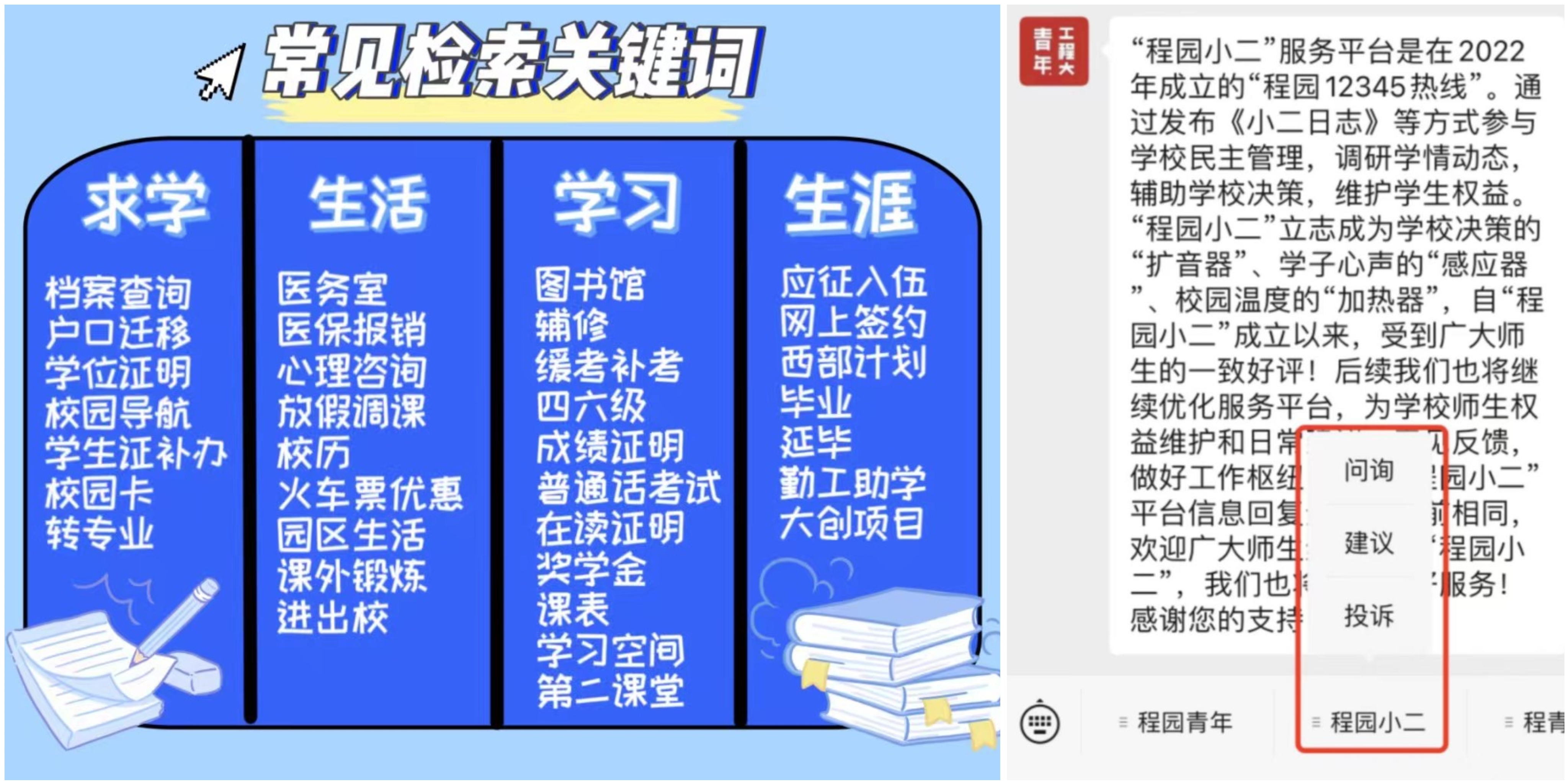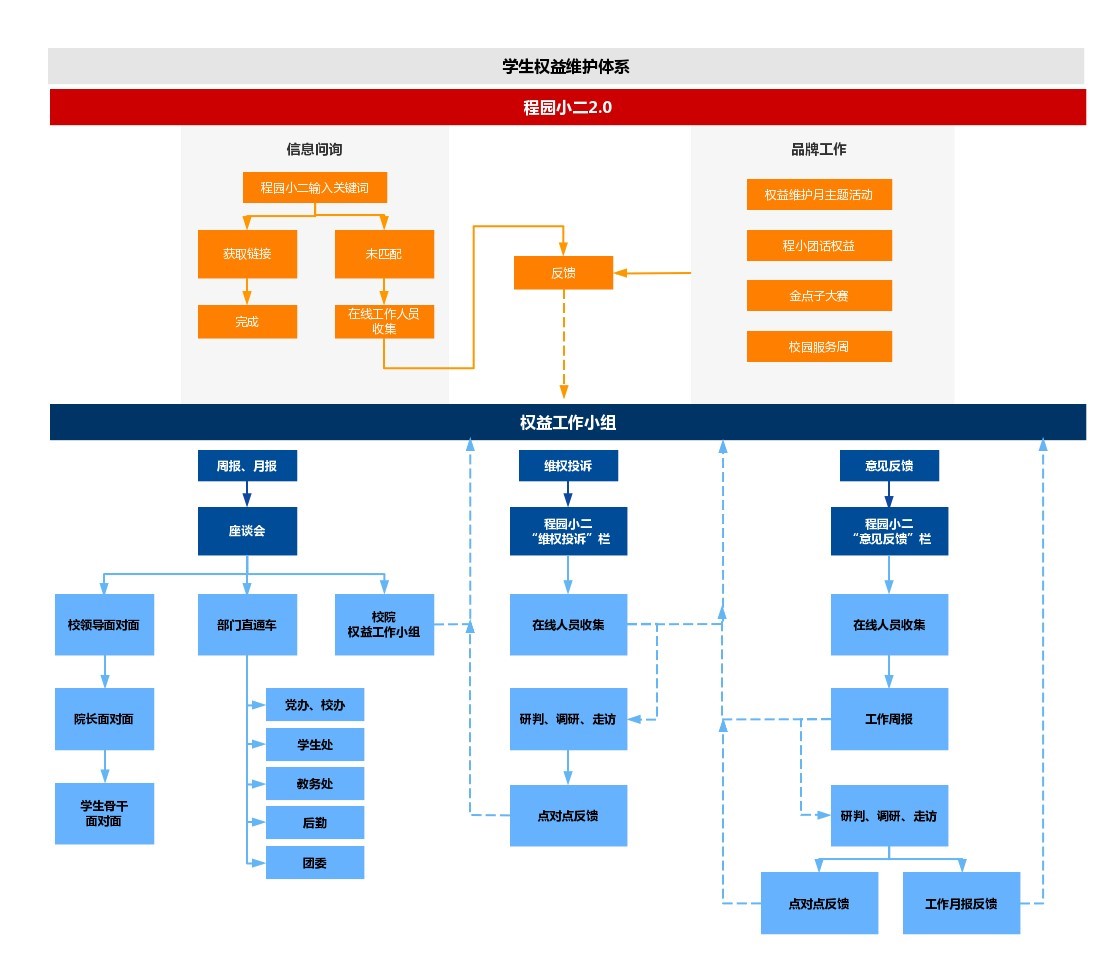 搭建学生权益维护工作平台。以“程园小二”特色品牌为着力点,构建线上、线下两个权益维护工作平台,让学生有渠道反馈、有人员联系、有踪迹可循。在学生会组织办公室设置“权益接待日”,对学生提出的日常诉求、问题反馈、工作建议和学校建设等方面的意见做线下接待。对“程园小二”进行升级,在后台开发关键词回复功能板块区、意见反馈区、超链接功能区,精简学生信息问询、资源查询、业务办理等的时长。同时做好学生后台数据的分析研判,梳理月度信息平台内容及反馈,建立公示月度工作报表及反馈机制,真正发挥好线上沟通、反馈简便的优势。真正发挥数据的效度,提升工作效率。