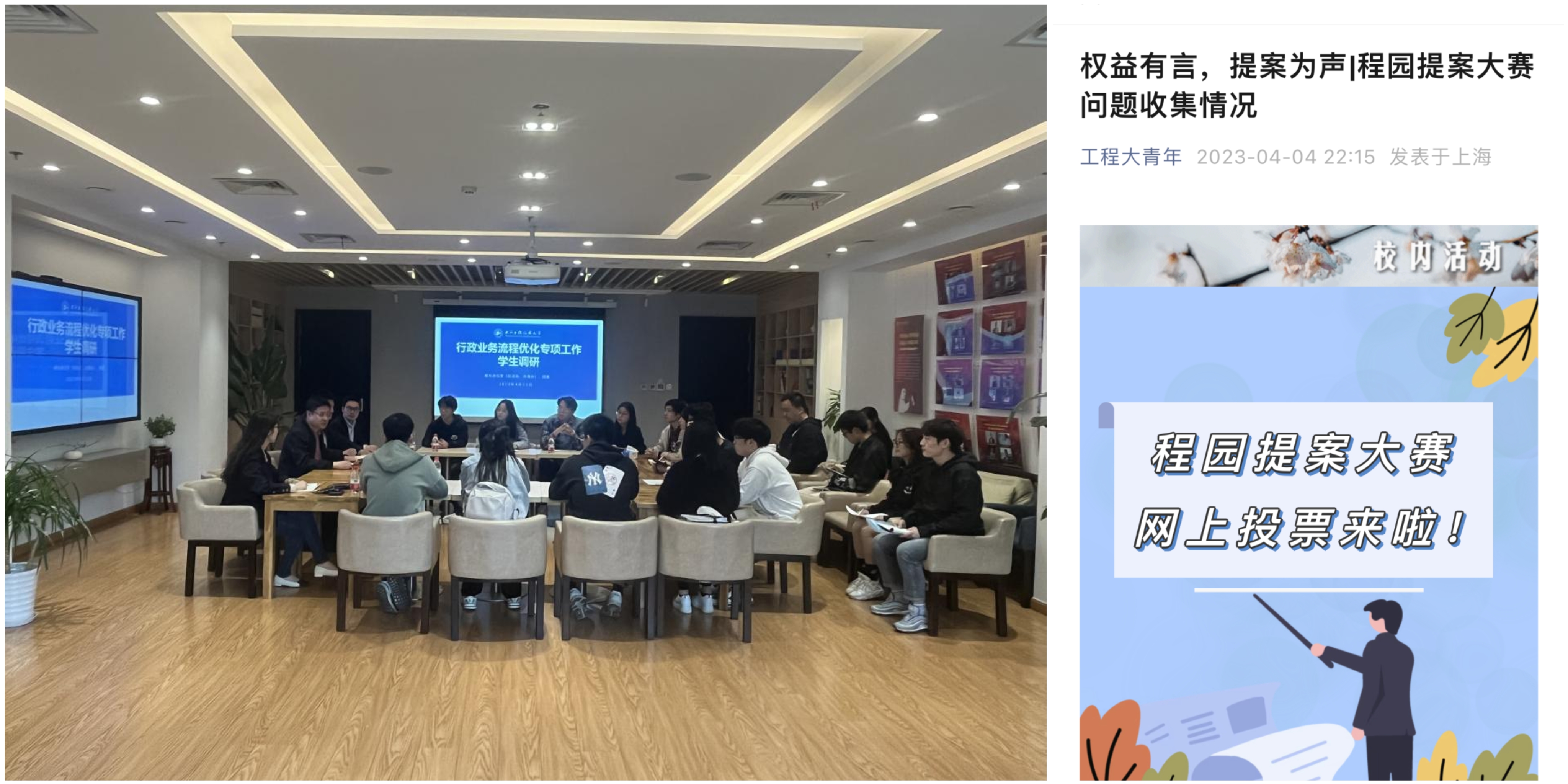 推动学生权益维护工作融合。继续搭建校领导和学生“零距离交流,心贴心倾听”的沟通平台,通过开展“校领导”面对面、院长面对面、学生骨干面对面等“面对面”系列活动,促进师生沟通,贴近同学们的思想、学习、生活情况,听取他们对学校工作的建议和意见。在程园小二2.0“周报日志”基础上,做好数据研判,由校团委牵头,由学生权益工作小组、学生代表组成代表团,常态化与业务部门开展“部门直通车”座谈会,畅通同学和业务部门的交流,更加直接地解决工作中涉及的学生日常管理、教育教学、后勤服务等问题,同时在“工程大青年”公众号上以工作月报形式通报工作推进。将与职能部门、学生权益维护工作小组的座谈会开到经常、开到日常、解决平常。