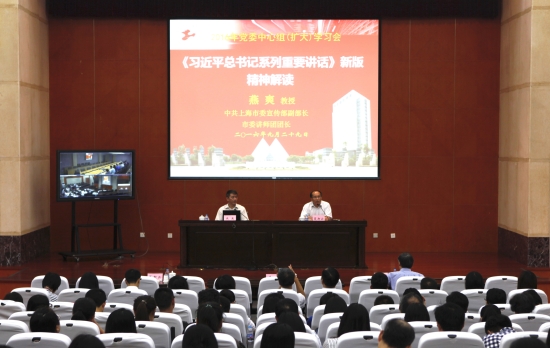 为深入学习领会习近平总书记系列重要讲话精神,9月29日下午,学校召开党委中心组扩大学习会,上海市委宣传部副部长、市委讲师团团长燕爽教授应邀来校作了题为“《习近平总书记系列重要讲话读本》(2016版)精神解读”辅导报告。校党委副书记夏斯云、副校长鲁嘉华,中心组成员、中层干部、支部书记、学生辅导员近200人参加了会议。会议由夏斯云副书记主持。