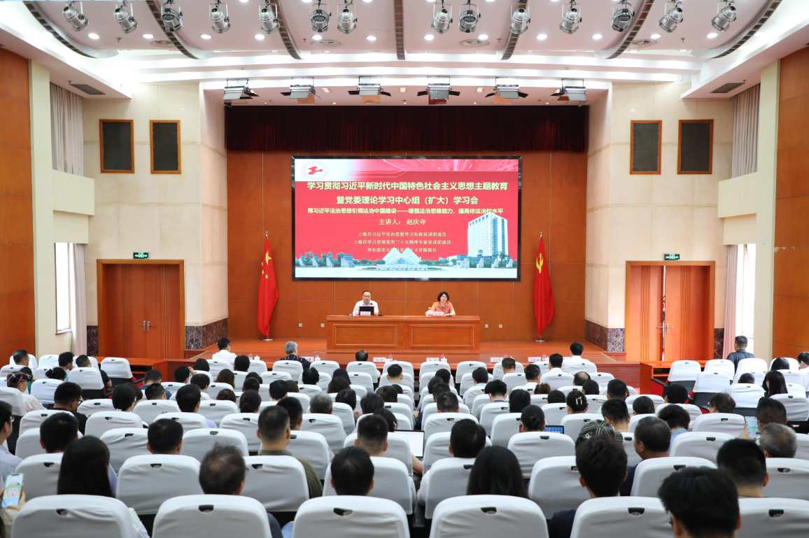 8月15日下午,学校召开学习贯彻习近平新时代中国特色社会主义思想主题教育暨党委理论学习中心组(扩大)学习会,特邀上海市习近平法治思想学习实践宣讲团、上海市学习贯彻党的二十大精神专家宣讲团成员、华东政法大学马克思主义学院院长、教授、博士生导师赵庆寺来校作题为《用习近平法治思想引领法治中国建设——增强法治思维能力,提高依法治校水平》的专题辅导报告。校党委中心组成员、中层干部、辅导员代表参加会议,会议由校党委副书记、副校长朱晓青主持。