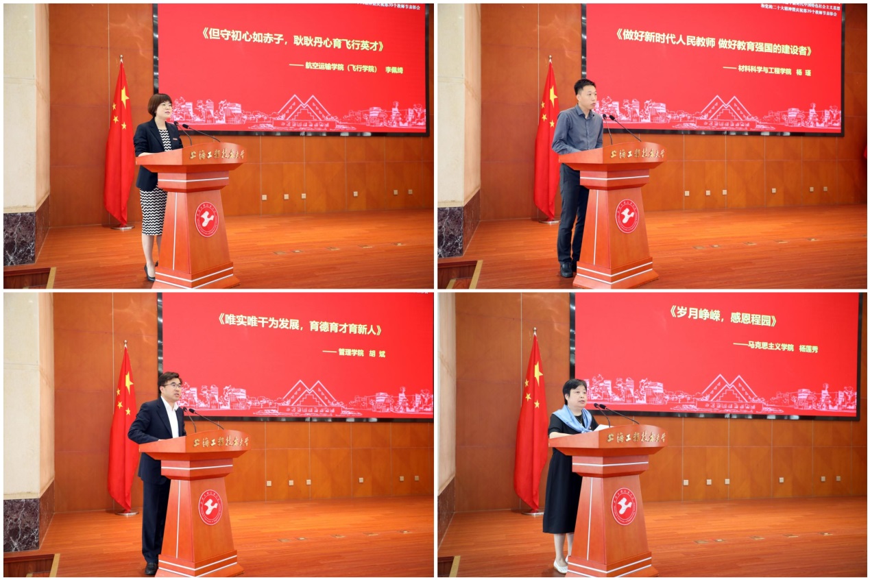 航空运输学院(飞行学院)李佩绮老师、材料科学与工程学院杨瑾老师、管理学院胡斌老师、马克思主义学院杨莲秀老师分别以《但守初心如赤子,耿耿丹心育飞行英才》《做好新时代人民教师 做好教育强国的建设者》《唯实唯干为发展,育德育才育新人》《岁月峥嵘,感恩程园》为题,从不同角度对“老师”一词进行了诠释,展现了工程大人为学校教育事业发展作出的不懈努力。