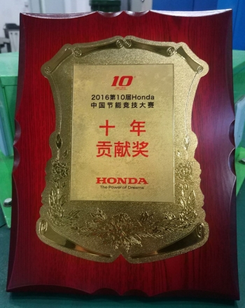 日前结束的第十届HONDA中国节能竞技大赛上,我校与同济大学、北京理工大学、西安交通大学等著名高校一起接受了本田(中国)有限公司授予的HONDA中国节能竞技大赛十年贡献奖。此奖表彰高校鼓励大学生创新实践,对推动中国节能汽车技术发展作出的重要贡献。