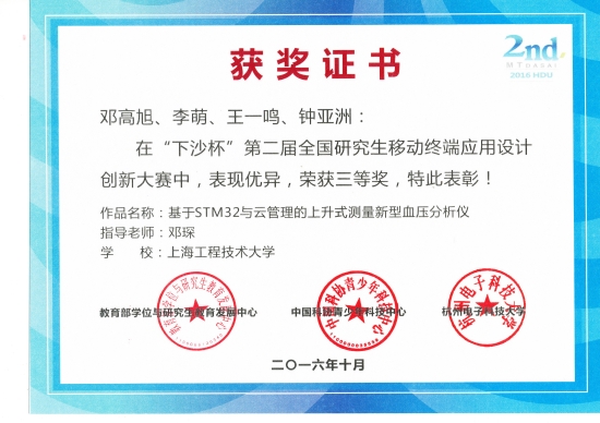 近日在杭州举行的第二届全国研究生移动终端应用设计创新大赛全国总决赛上,我校由电子电气工程学院邓琛老师指导,管理学院邓高旭、李萌、王一鸣和钟亚洲4位研究生组成的团队杀入决赛,最后获得三等奖。
