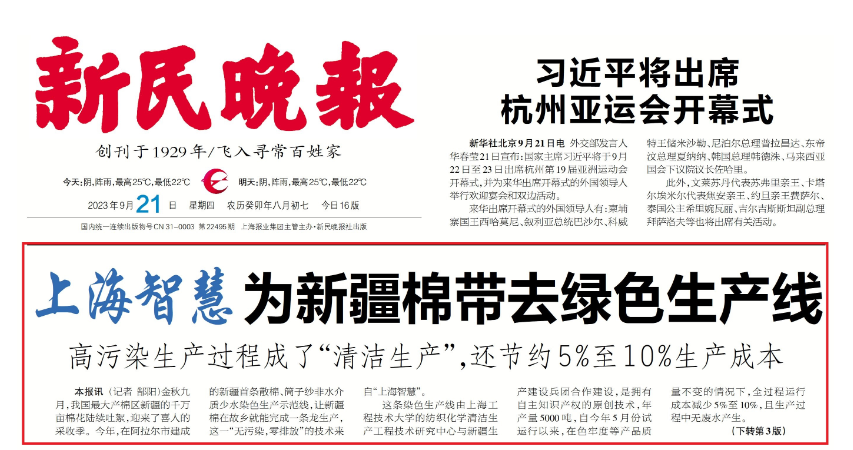 编者按 近日,《新民晚报》头版头条以《上海智慧为新疆棉带去绿色生产线》为题,《上海科技报》第4版整版以《颠覆印染工业的中国原创技术诞生—— 完美“染色”不会产生一滴“污水”》为题,《光明日报》以《上海工程技术大学:高效智慧助力新疆棉纺产业构建新格局》为题,报道了我校上海纺织化学清洁生产工程技术研究中心王际平教授团队,技术援疆,拥有自主知识产权的项目实现技术成果转化,在阿拉尔市建成新疆首条散棉、筒子纱非水介质少水染色生产示范线。