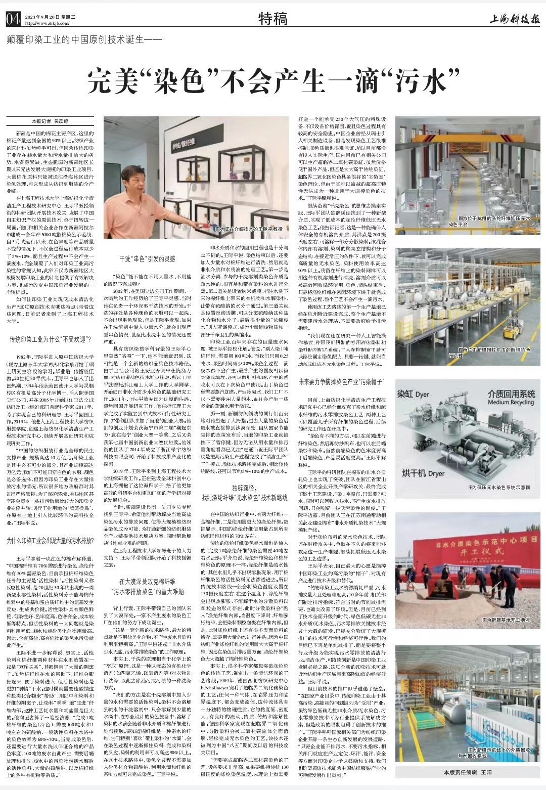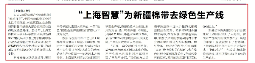 上海科技报 链接《颠覆印染工业的中国原创技术诞生—— 完美“染色”不会产生一滴“污水”》