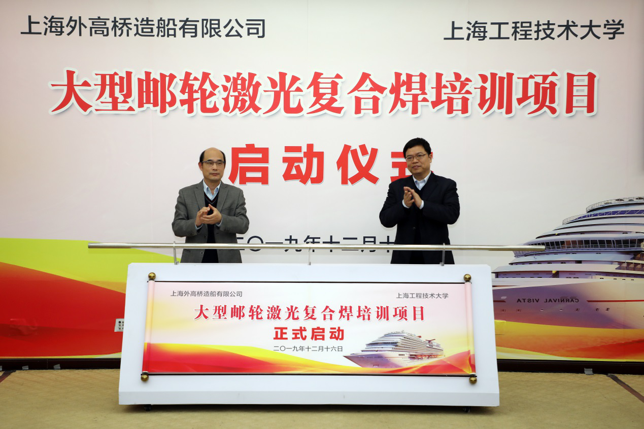 副校长夏春明和上海外高桥造船有限公司副总经理刘建峰共同启动“大型邮轮激光复合焊培训项目”。