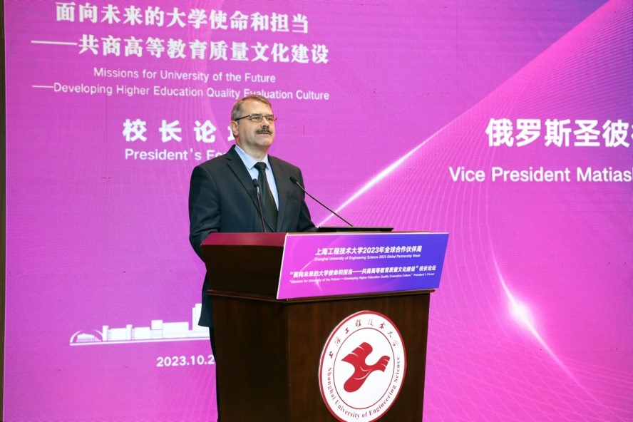 Matiash Valerii副校长以“未来大学的使命——发展高等教育质量评价文化”为题,以俄罗斯圣彼得堡国立航空航天大学为例,介绍了学校的历史和规模,分享了学校的教育质量管理系统。他表示,现代高等教育机构面临日益激烈的竞争,需要不断提高教育服务质量,确保吸引力,他强调了全面质量管理原则以及内部和外部评估方法的重要性,以此确保教育和科研质量的持续改进。