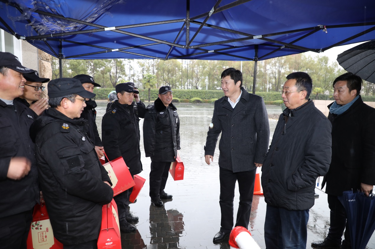校领导一行先后来到学校门卫、保卫处监控室、教学楼、学生公寓、第二食堂、科创楼大厅看望慰问坚守岗位的安保人员、宿舍楼管人员、后勤工作人员,每到一处,都与在岗工作人员一一握手致意,向大家恭贺新年。
