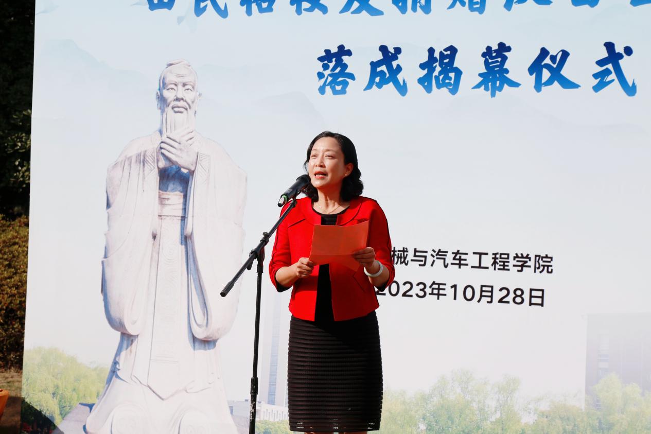 10月28日下午,在建校45周年之际,机械与汽车工程学院毕业生、山东校友分会会长、欣格瑞(山东)环境科技有限公司董事长田民格,向学校捐赠汉白玉孔子像落成揭幕仪式在教学楼C楼前举行。校长俞涛、校友田民格出席活动,校长办公室主任王佳杰、机械与汽车工程学院党委书记虞蓉、基建处副处长范祚迅、机械与汽车工程学院师生代表50余人参加活动。仪式由机械与汽车工程学院党委副书记黄中子主持。